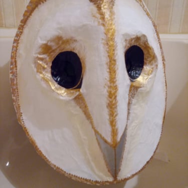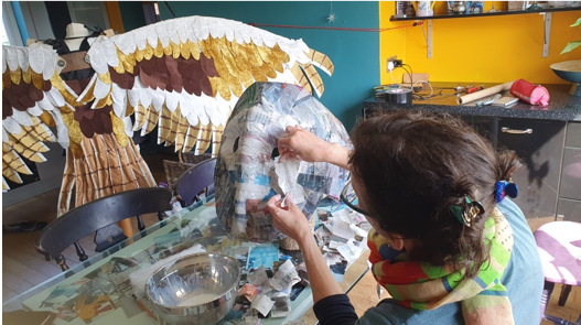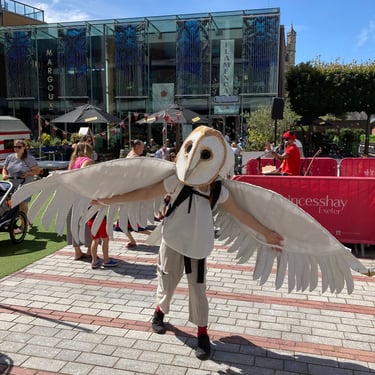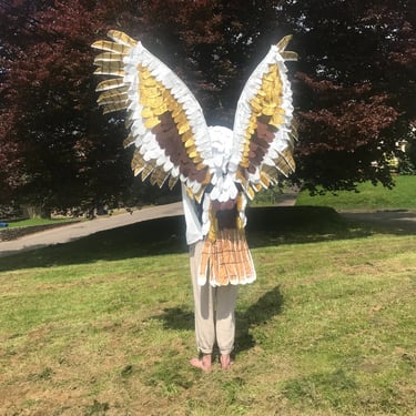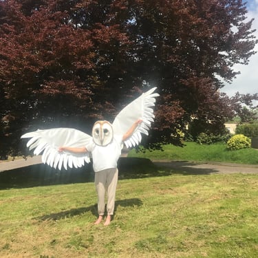 The other key feature is the size of the head and eyes. This was my main challenge and I tried various techniques to create this. The biggest challenge was finding a way to balance the head and have the eyes in the right place for the performer to see through, as barn owl eyes are not in the same proportion as ours. I used an old sleeping matt structured over a cycle helmet and layered with stuffing and papier mache, then painted with many layers of white acrylic. Artist Jen Major painted the owl's distinctive facial features, highlighting the gold from the wings giving impact and a carnival feel.